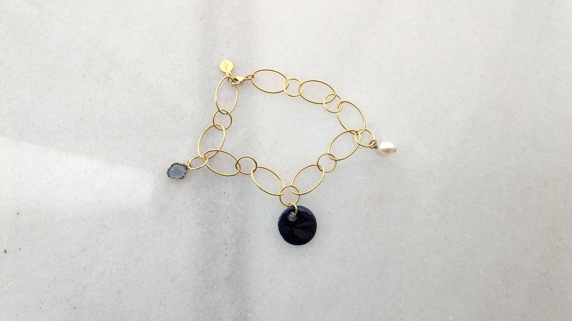 Bracelet doré à l'or fin 24 carats, sertis d'un pendentif en cristal de roche, d'une perle d'eau douce et d'un pendentif en porcelaine modelé et émaillé à la main.